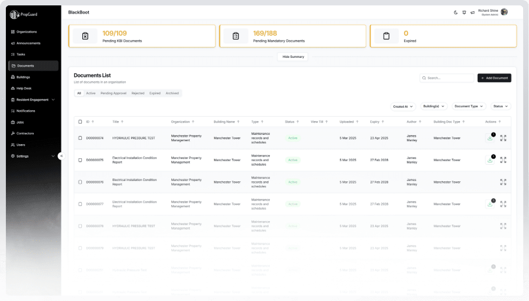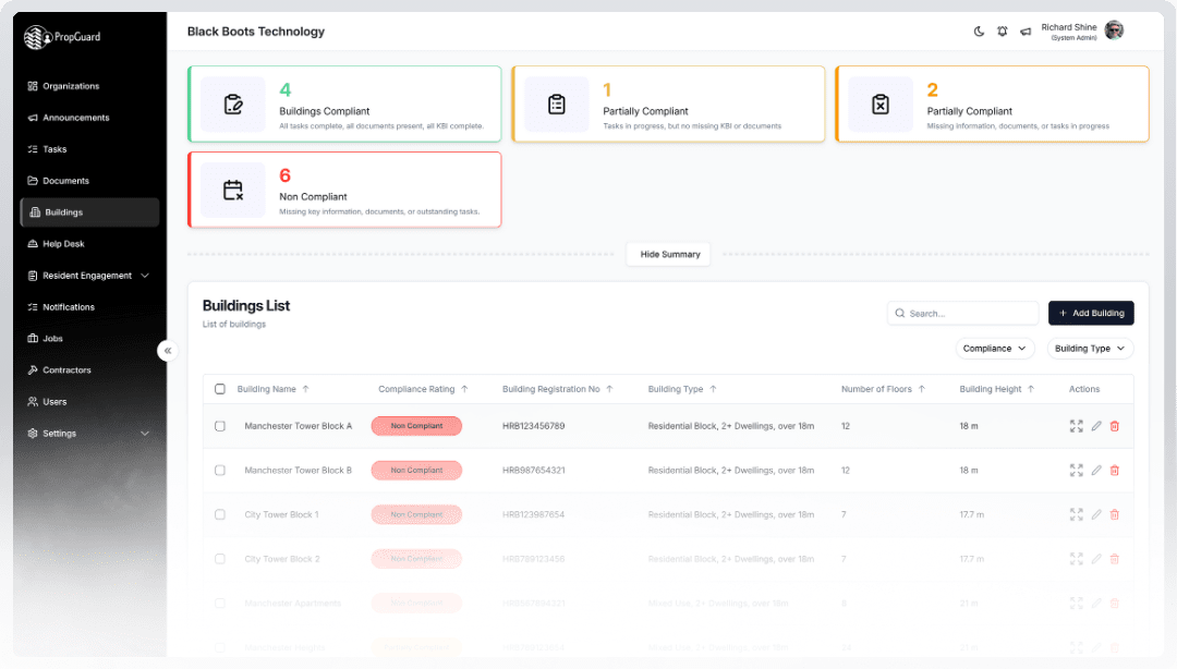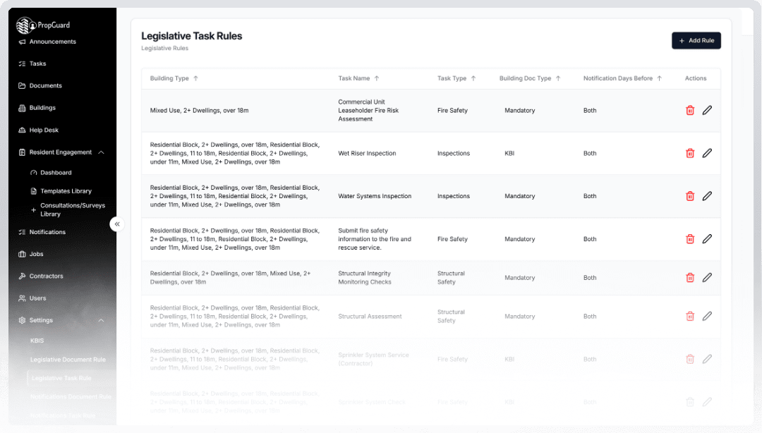 Demonstrate full compliance with the building safety act and other building specific legislations. PropGuard has building specific capabilities which allows you to automates the scheduling of relevant building safety tasks. The real-time compliance monitoring allows you to instantly check the compliance level of your building.